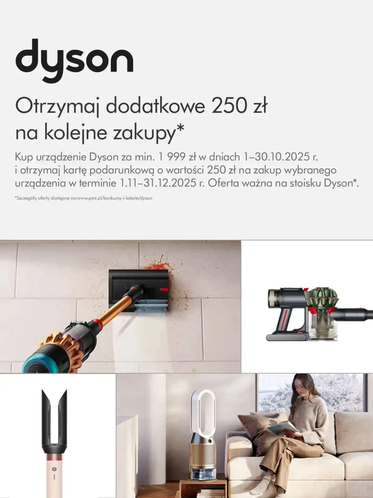 W dniach 1-30.10.2025r kup urządzenie Dyson za min 1999 zł, a otrzymasz kartę podarunkową o wartości 250 zł na zakup wybranego urządzenia Dyson. Kartę możesz zrealizować w terminie 1.11-31.12.2025 r. Oferta ważna tylko na stoisku Dyson.*