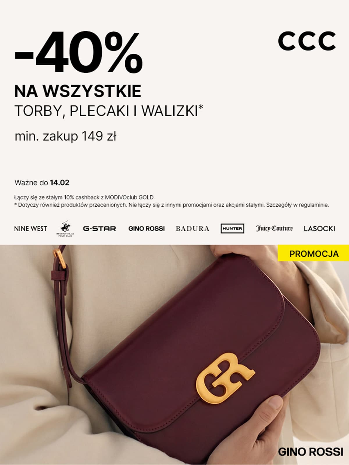 Nowa torebka? Plecak? Walizka? A może kosmetyczka, która zmieści wszystko to, co niezbędne? Teraz w CCC modele znanych marek kupisz 40% taniej! Zrób zakupy za minimum 149 zł i zyskaj rabat na wymarzone torebki, plecaki, walizki lub kosmetyczki! Superceny czekają w CCC!