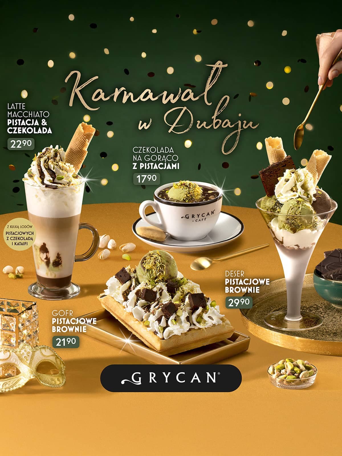 Do 17 lutego 2026 r. w sieci lodziarnio-kawiarni GRYCAN dostępna jest wyjątkowa, karnawałowa oferta, inspirowana dubajskim bogactwem smaków i kontrastem struktur. Menu łączy intensywne nuty czekolady z kremową pistacją oraz elementami chrupkości i słodyczy. Deser Pistacjowe Brownie, Gofr Pistacjowe Brownie, a może Czekolada na gorąco z Pistacjami lub kawa Latte Macchiato Pistacja & Czekolada? Każda z tych propozycji zachęca do celebracji i wprowadza w karnawałowy nastrój.