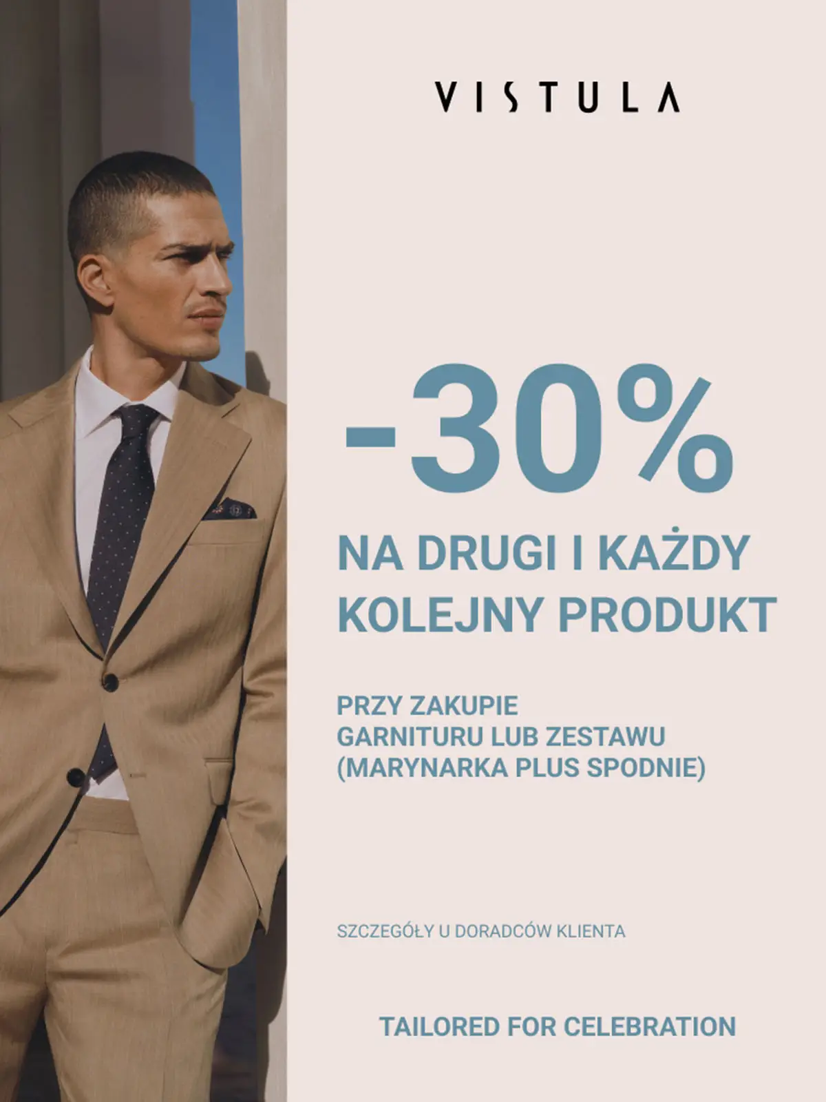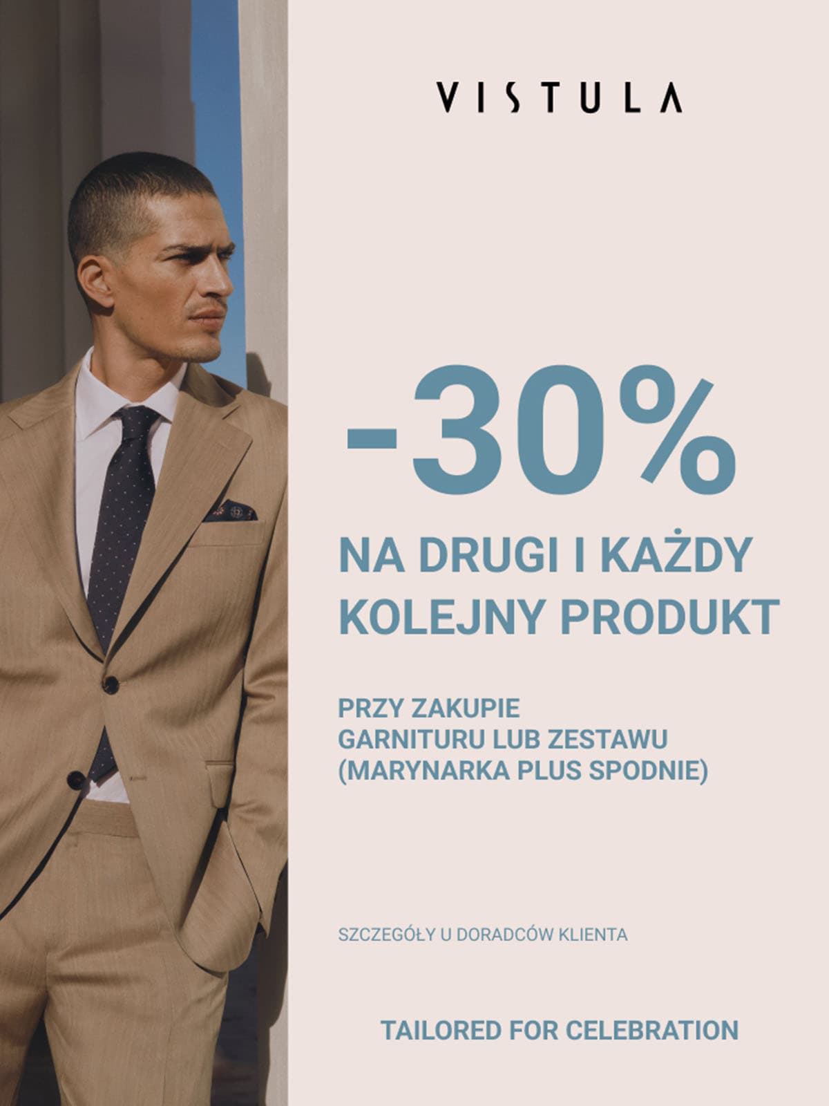 Skorzystaj z promocji -30% na drugi i każdy kolejny produkt przy zakupie garnituru lub zestawu (marynarka + spodnie).
