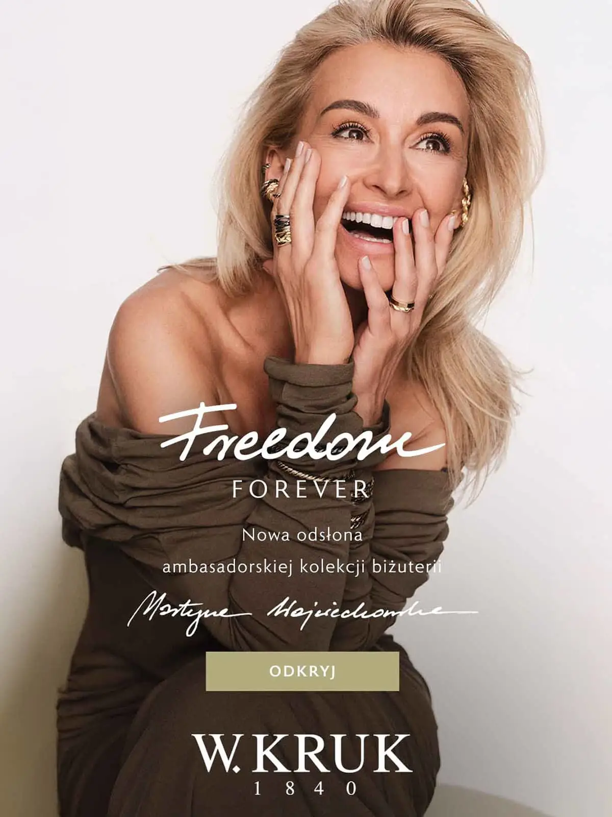 i współtworzy kolekcję biżuterii Freedom. Autorska kolekcja doczekała się na przestrzeni lat kilku bestsellerowych edycji. W jubileuszowym roku W.KRUK i Martyna przedstawiają najnowszą odsłonę kolekcji biżuterii, która symbolizuje wolność, jako najważniejszą wartość – współcześnie,
