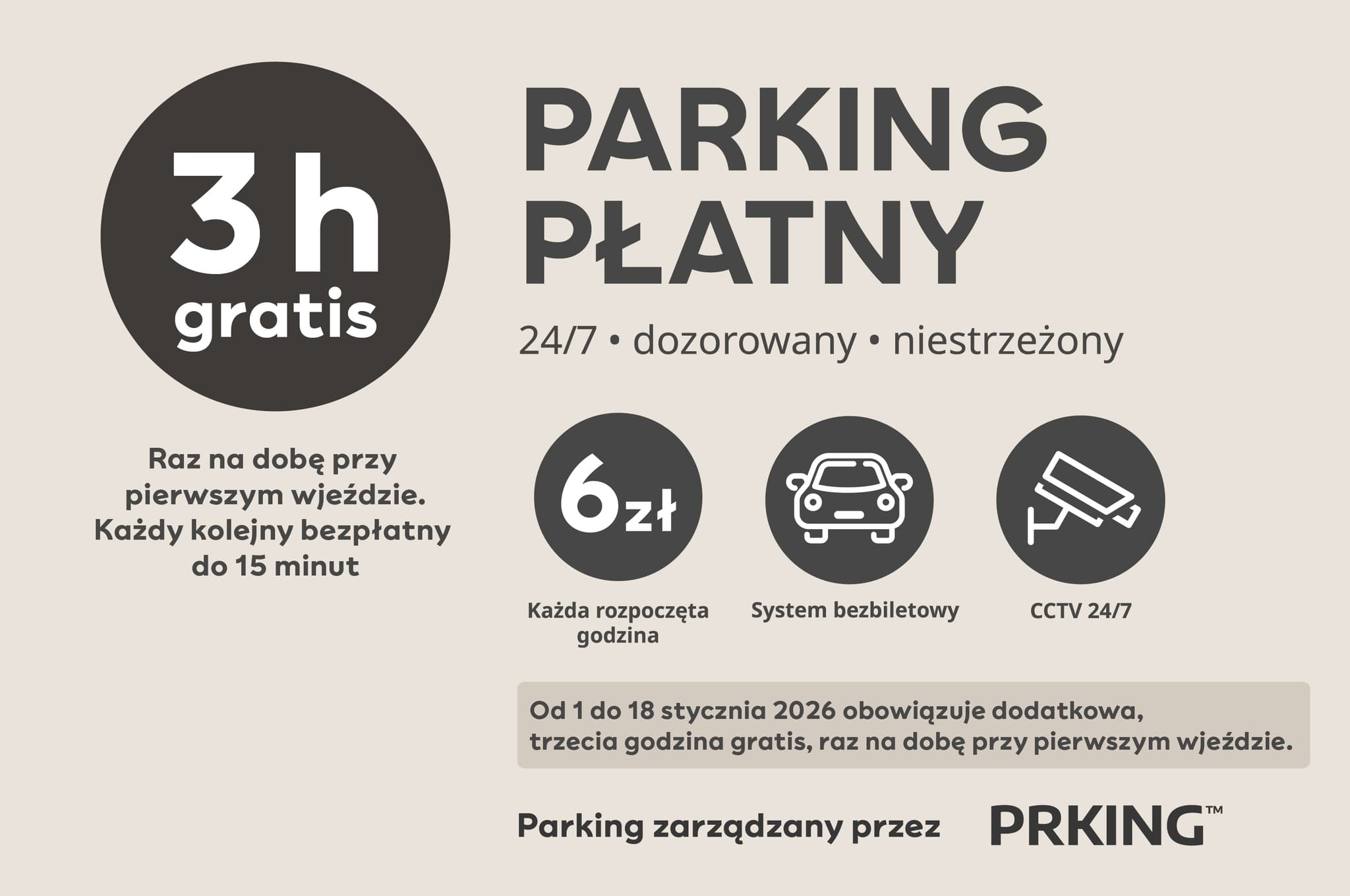 👉 Pierwszy wjazd na parking w ciągu doby, umożliwia bezpłatne parkowanie do 3 godzin w okresie od 28.11.2025 do 18.01.2026. Poza wskazanym okresem standardowy czas korzystania z parkingu bezpłatnie to 2 godziny. Zawsze każdy kolejny wjazd pozostaje bezpłatny do 15 minut (np. przy podwożeniu bliskich).