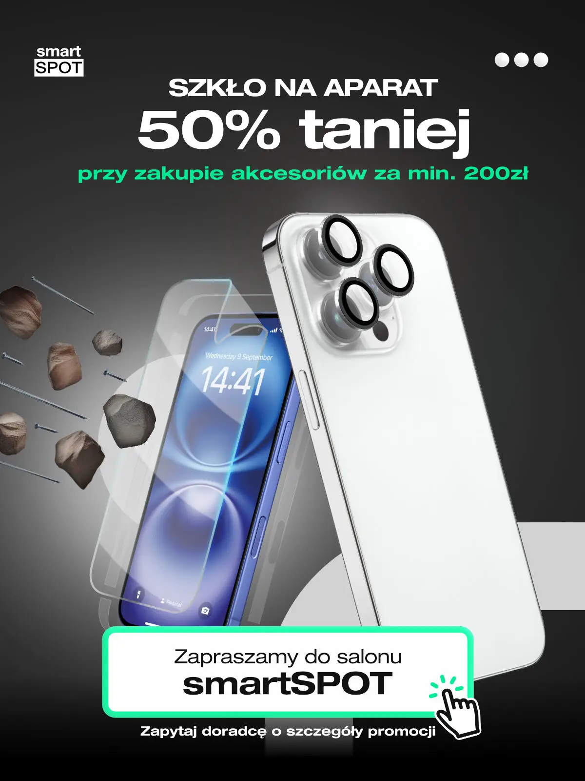 Wpadnij do salonu smartSPOT i wybierz dla siebie akcesoria za 200 zł, a w zamian otrzymasz szkło na aparat 50% taniej.