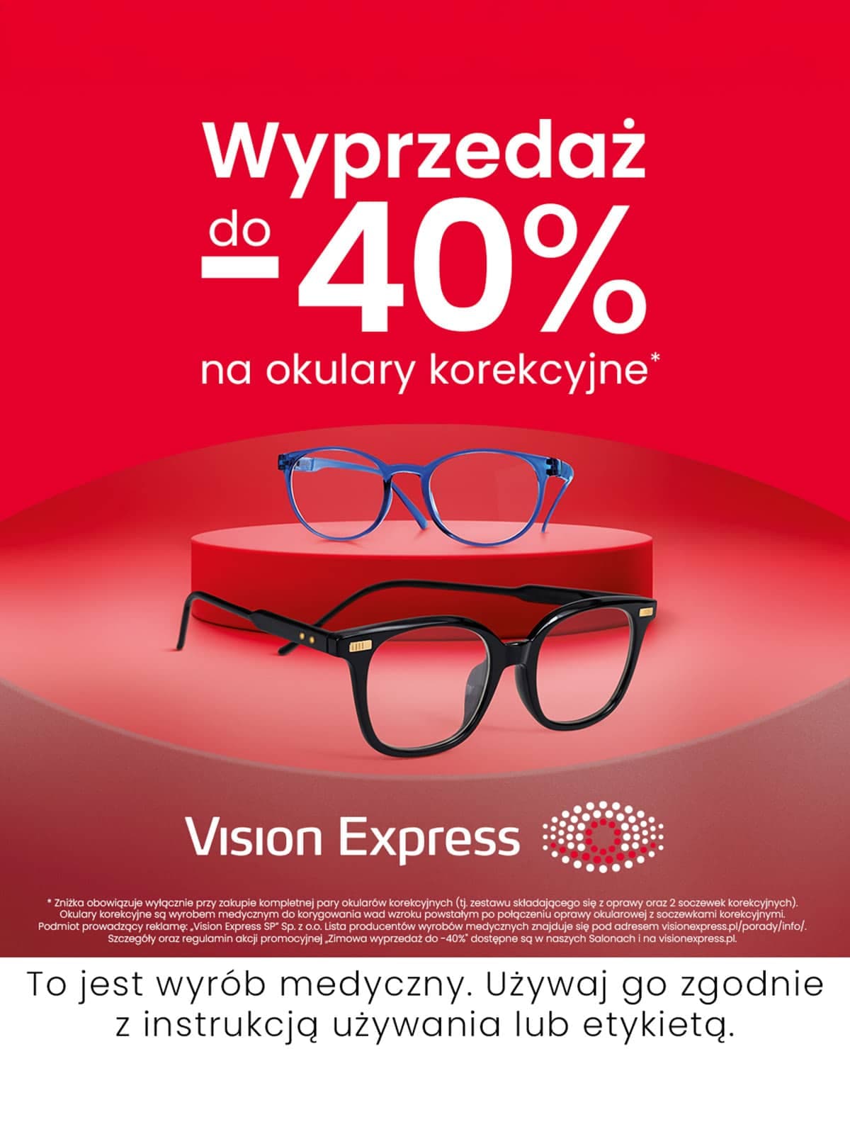Okulary korekcyjne są wyrobem medycznym do korygowania wad wzroku powstałym po połączeniu oprawy okularowej z soczewkami korekcyjnymi. Podmiot prowadzący reklamę: „Vision Express SP” Sp. z o.o. z siedzibą w Warszawie. Lista producentów wyrobów medycznych dostępna pod adresem visionexpress.pl/porady/info/.